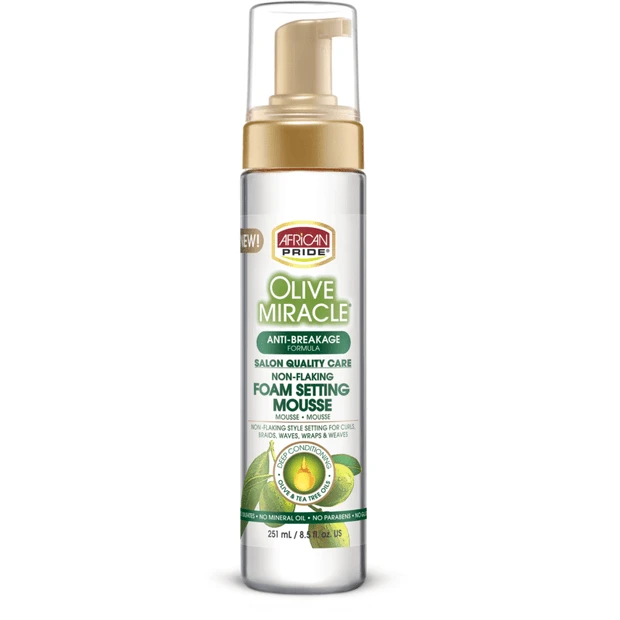 La mousse fixante African Pride® Natural Salon Care est une formule sans alcool qui ne s’écaille pas et qui permet de contrôler durablement les frisottis et d’apporter de la brillance aux boucles, aux ondulations, aux tissages, aux perruques, aux enroulements et aux tresses. Les huiles d’olive et d’arbre à thé nourrissent et font briller les cheveux. Parfait pour les cheveux naturels, les styles courts et les styles moulés. Un excellent contrôle des fuites pour les styles de protection.