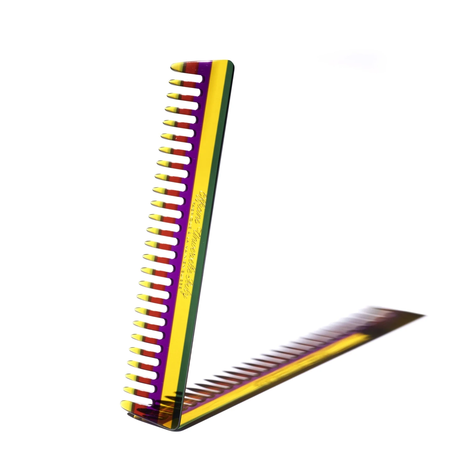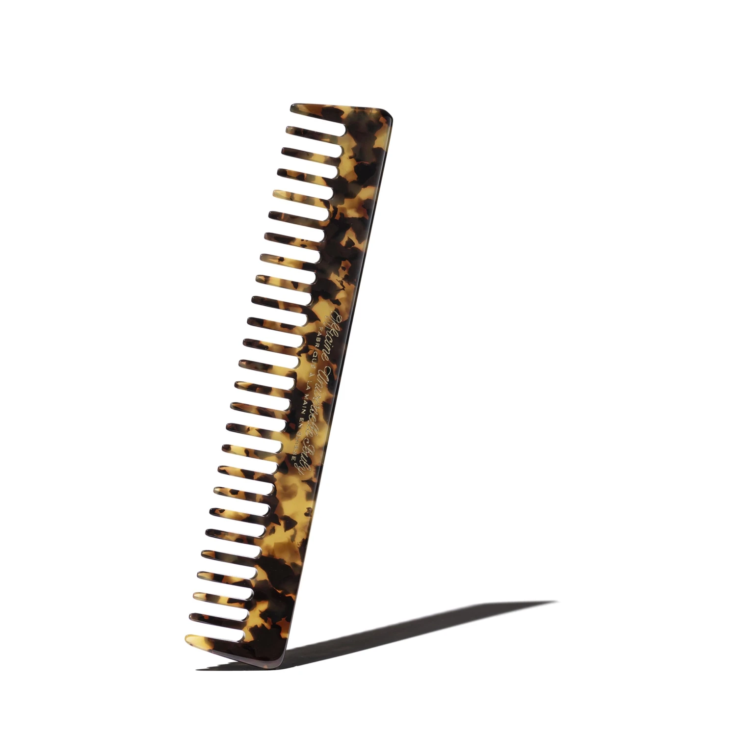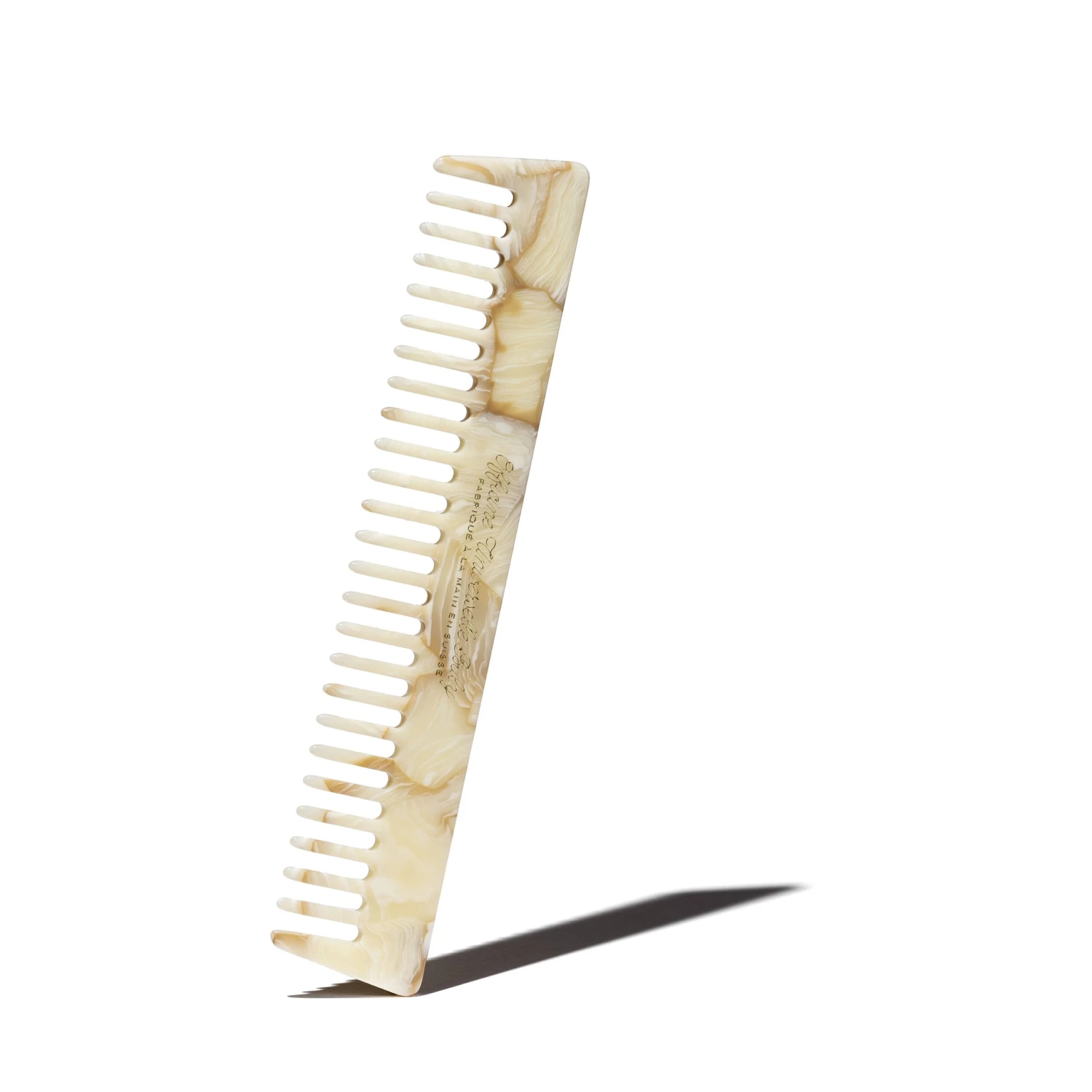 Ce grand peigne de l’Officine, tout en angles arrondis, va amadouer avec maestria les cheveux les plus longs. Ses dents régulières, à espacement très large pour ne pas casser les boucles, rendent le démêlage plus doux. Il tient parfaitement dans la main et se décline en trois teintes : écaille de tortue, ivoire ou jaune ambré. De bonne taille, ce peigne se glisse néanmoins aisément dans un sac et ses lignes légèrement anguleuses si particulières en font un des peignes les plus prisés des amateurs de belles choses et autres esthètes.