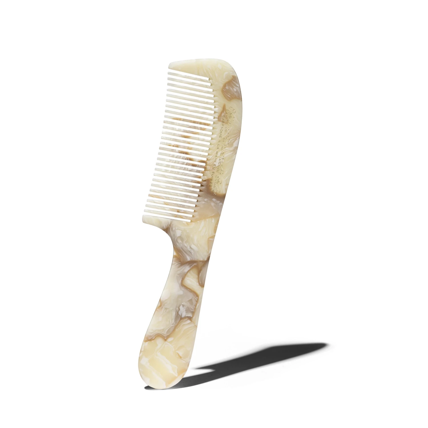 Ce peigne est fabriqué à la main en Suisse par l’un des derniers fabricants d’Europe. Taillé dans un bloc d’acétate de très haute qualité, il est façonné, sculpté et poli. Les dents et les entailles sont spécialement agencées pour ne pas blesser les cheveux. L’acétate, fibre végétale, révèle un motif unique, propre à chaque peigne.