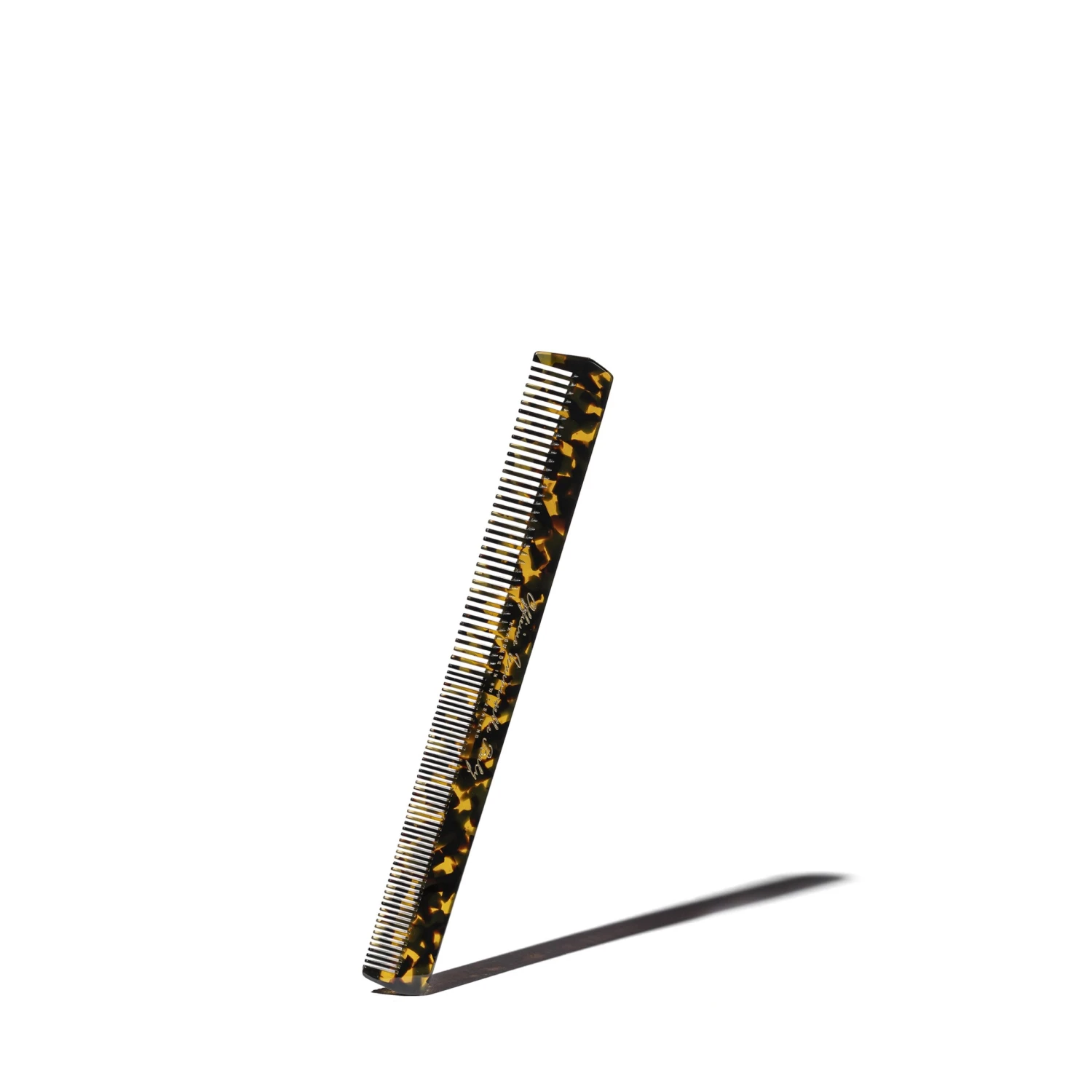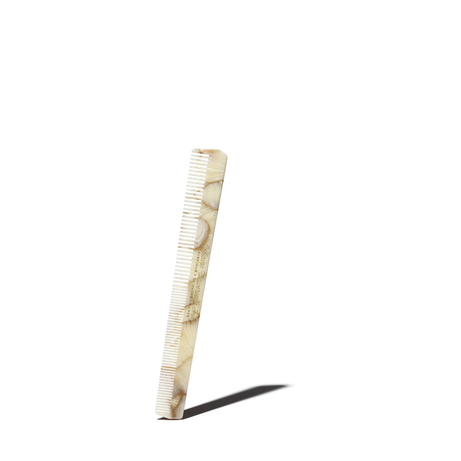 Ce peigne est fabriqué à la main en Suisse par l’un des derniers fabricants d’Europe. Taillé dans un bloc d’acétate de très haute qualité, il est façonné, sculpté et poli. Les dents et les entailles sont spécialement agencées pour ne pas blesser les cheveux. L’acétate, fibre végétale, révèle un motif unique, propre à chaque peigne.