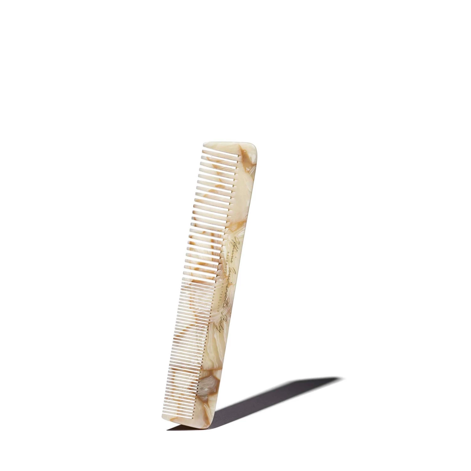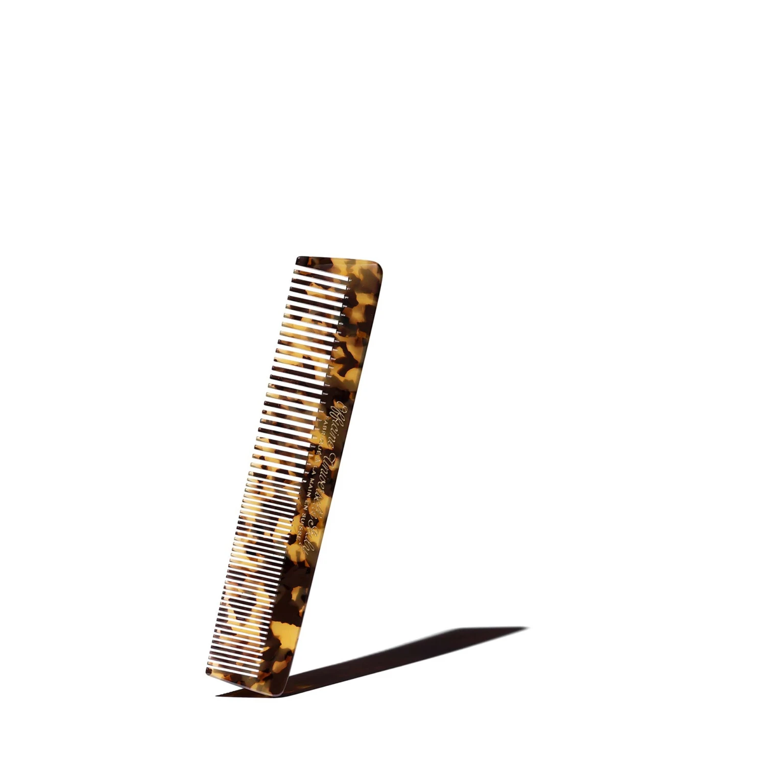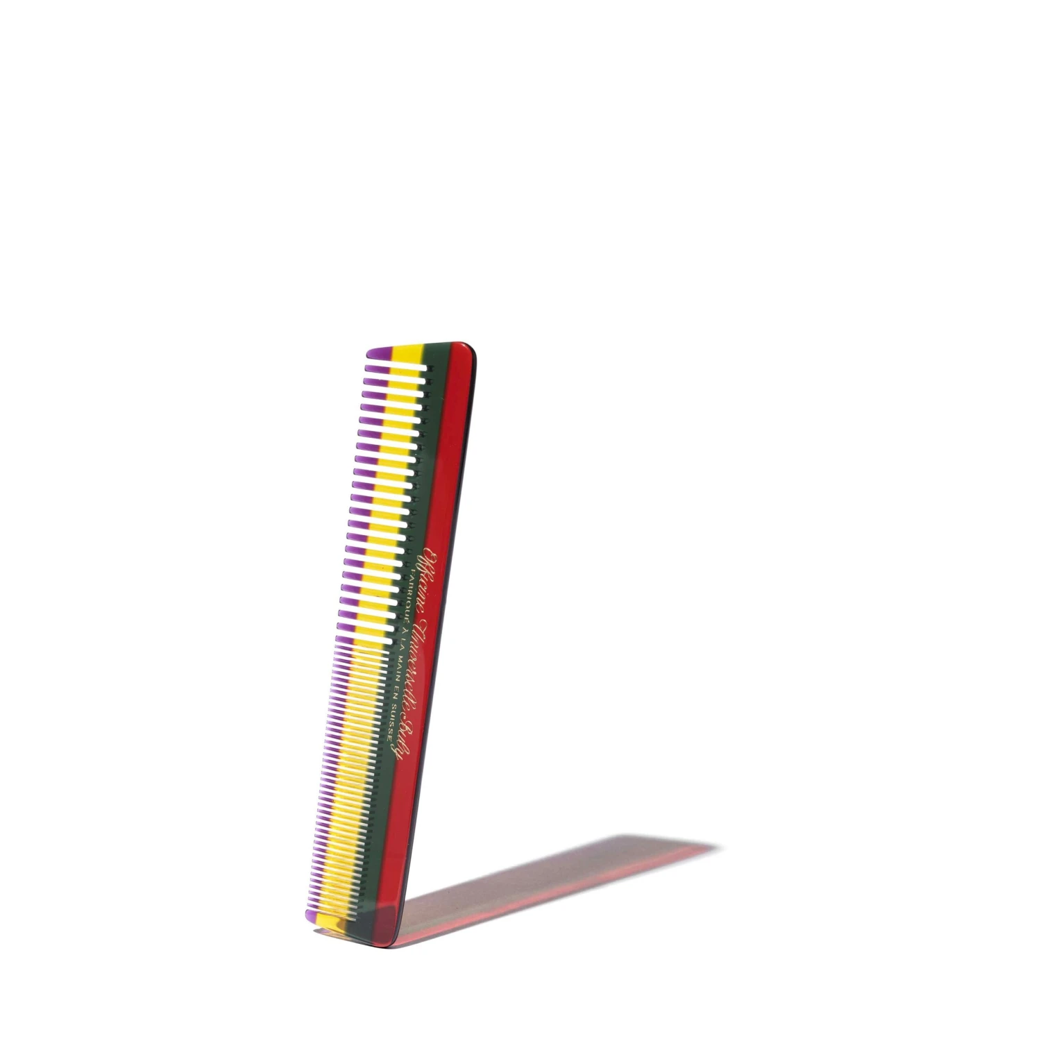 Ce peigne est fabriqué à la main en Suisse par l’un des derniers fabricants d’Europe. Taillé dans un bloc d’acétate de très haute qualité, il est façonné, sculpté et poli. Les dents et les entailles sont spécialement agencées pour ne pas blesser les cheveux. L’acétate, fibre végétale, révèle un motif unique, propre à chaque peigne.
